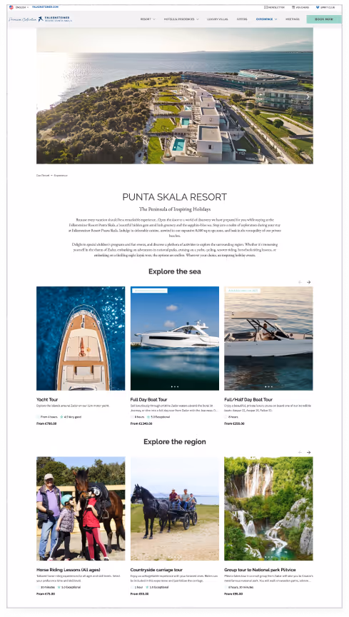 A range of inspiring holiday adventures immediately captures attention upon visiting the experiences page of Falkensteiner’s Punta Skala Resort. From sea adventures, day tours and spa treatments to kids’ academies, rentals and transfers, their experience page serves as a great example of how thoughtfully organized categories offer a clear overview of the hotel's focus areas and local activities. Each experience features a brief description, duration, and price displayed directly on the main page, enabling guests to easily get all the essential details without needing to navigate to individual experience pages.