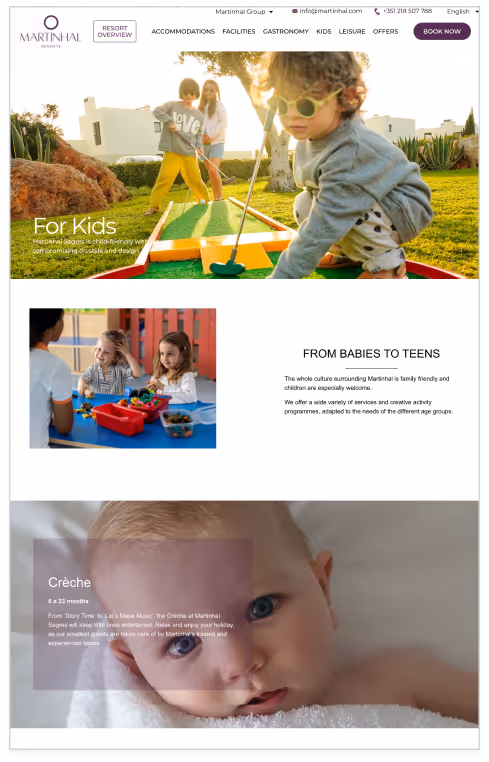 Martinhal Sagres Family Beach Resort’s website highlights its focus on gastronomy and kid-friendly activities through its navigation bar, targeting families seeking luxury dining and entertainment for children. Subpages provide detailed insights, with the gastronomy page showcasing in-house restaurants, bars, and food shops, while the kids’ page outlines activities, programs, and services for various age groups. This structure positions Martinhal’s brand effectively, differentiating it from competitors and communicating its offerings more clearly than a single experience page would.