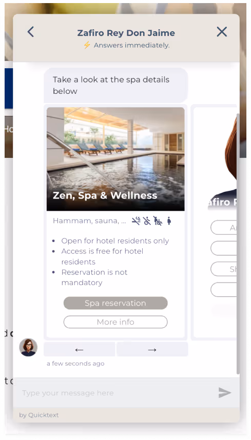 Zafiro Hotels built one of the rare hotel websites currently offering bookable experiences within the chatbot. When interacting with the chat, users are asked to select a topic and clicking on 'Visits and Tours’ opens an overview of activities guests can engage with during their stay. Each experience has a dedicated call-to-action 'Book now’ button which directs guests to the relevant experience, enabling them to complete a booking in only a few steps without manual search for the right experience.