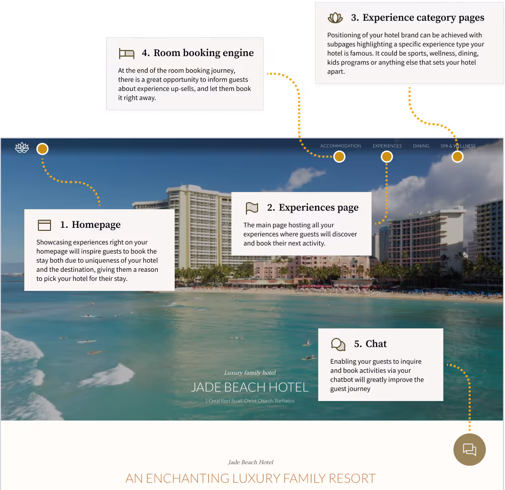 We analysed websites of best hotels in the world and found the following five areas of the website as key to success with selling experiences. These five areas complement each other as they map to different stages of the guest journey.